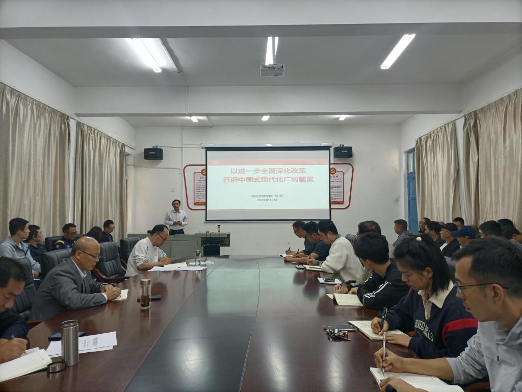 (通讯员 詹中新)10月10日下午,必赢565net官网网站举行党的二十届三中全会精神宣讲会,政法学院院长聂军作题为《进一步全面深化改革开辟中国式现代化广阔前景》的宣讲报告,必赢565net官网网站全体教职工参加学习。会议由必赢565net官网网站党委书记罗华国主持。