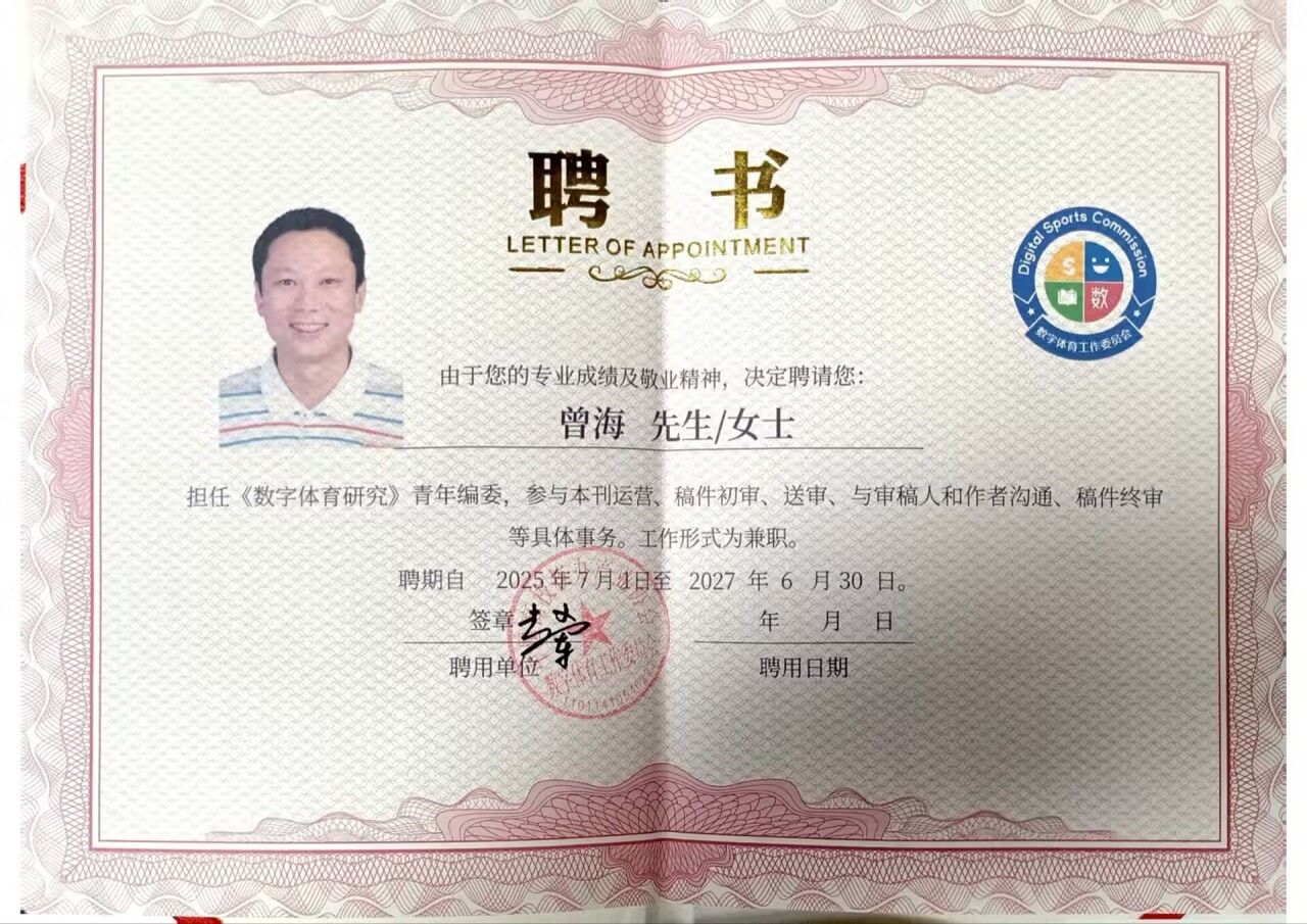 (通讯员 詹中新)2025年6月22日,由北京体育大学校长池建(博士、教授、博导)为编辑部主任、北京体育大学学报原编辑李勇勤研究员为《数字体育研究》编辑部副主任的《数字体育研究》杂志社正式公布首届青年编委名单,必赢565net官网网站教师曾海(副教授、哲学博士候选人、武汉必赢565net官网网站硕导、教育部、国家留学基金公派美国犹他大学访问学者、国际巧固球总会副秘书长、国际级A级教练)成功入选。此次评选经过严格的学术评审与综合考量,全国范围内共10名青年学者获此殊荣,曾海副教授凭借其在“幼儿篮球多智能体系统”研究、体育新兴项目融合创新等领域的突出贡献脱颖而出。