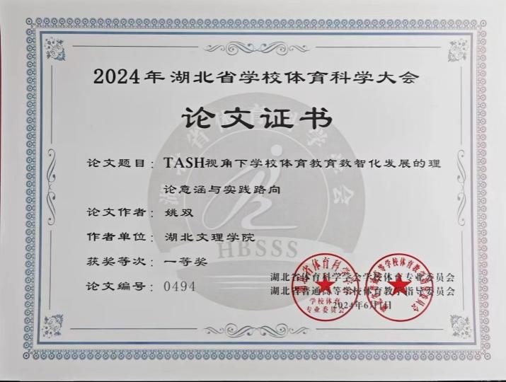 (必赢565net官网网站 通讯员 张明月)2024年6月1日,湖北省学校体育科学大会在长江大学隆重举行,必赢官网在读研究生姚双同学参加,并凭借其出色的论文《TASH视角下学校体育教育数智化发展的理论意涵与实践路向》荣获大会一等奖。