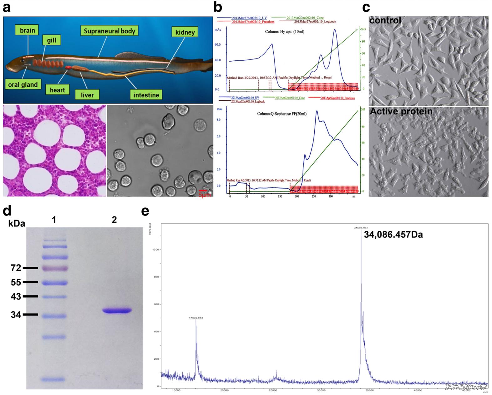 早期研究表明,七鳃鳗神经轴体组织的细胞分泌物具有对肿瘤细胞的杀伤活性。为了鉴定发挥功能的蛋白质,使用羟基磷灰石柱和Q Sepharose Fast Flow柱对细胞分泌物进行纯化,通过对细胞膜的破坏现象来评估蛋白质活性是否存在。收集这些含活性蛋白质的洗脱液并通过12%SDS-PAGE分析和MALD I-TOF质谱确定纯化的蛋白分子量为34,086.457 Da,并将该蛋白命名为LIP。