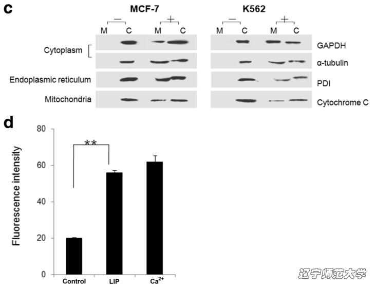 LIP主要作用于肿瘤细胞质膜上,能够破坏微管和线粒体的网状形态,使其片段化,而管状网络的内质网被转化为空泡特征。此外,LIP作用肿瘤细胞后,肿瘤细胞质中的甘油醛-3-磷酸脱氢酶(GAPDH),α-微管蛋白(α-tubulin),细胞色素C(Cytc)和蛋白质二硫键异构酶(PDI)释放到细胞外培养基中,说明LIP导致破坏肿瘤细胞膜结构。