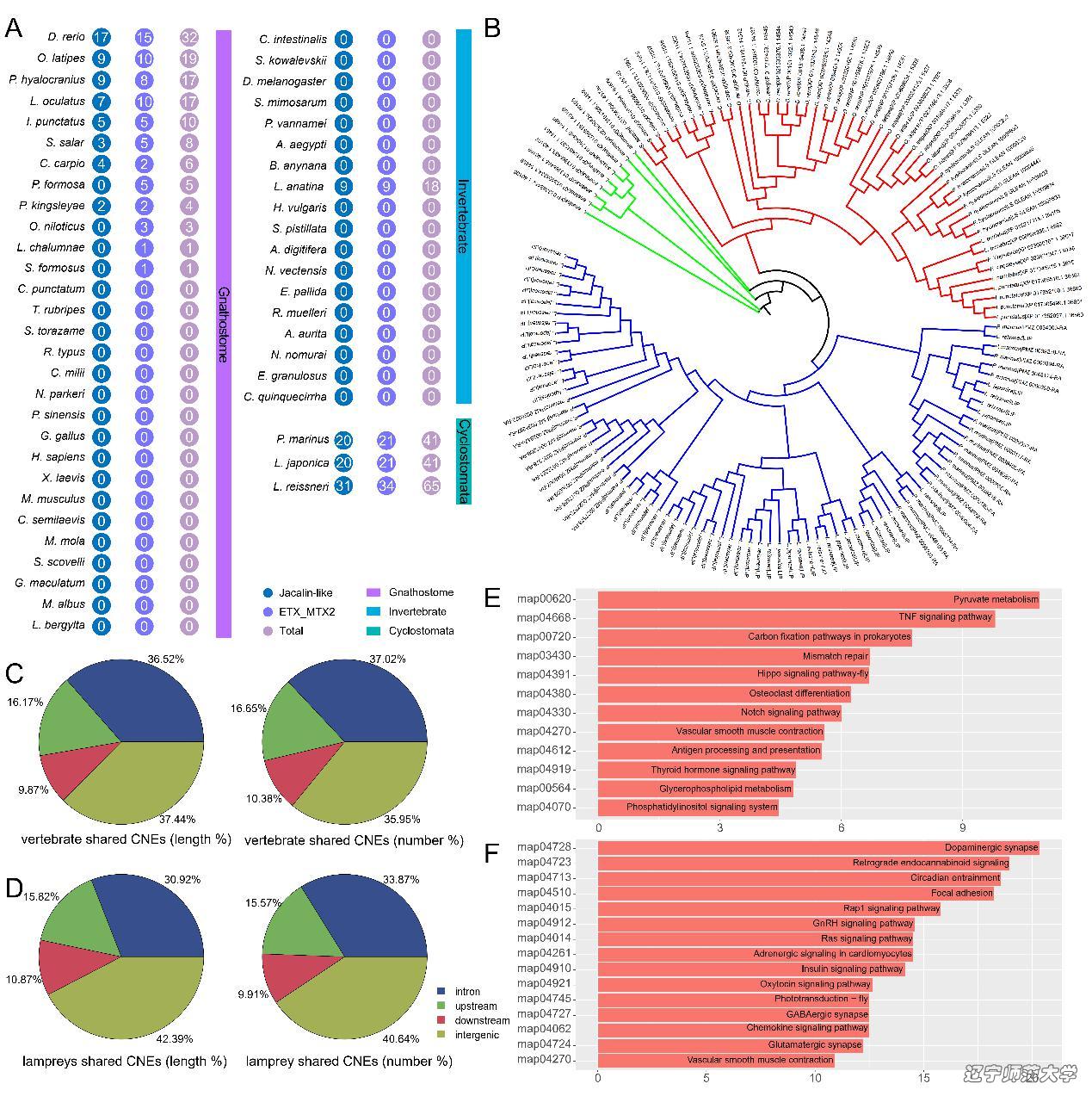 通过13个物种间的比较基因组学研究,我们推断雷氏叉牙七鳃鳗与日本七鳃鳗在10.7百万年前完成分化,而两者的共同祖先在19.4百万年前与海七鳃鳗完成分化;三种七鳃鳗均比其他脊椎动物表现出更快的进化速率。七鳃鳗特有的以及发生显著扩张/收缩的基因家族富集分析表明它们可能参与构建了七鳃鳗独特的生物学特性,为今后深入阐述圆口纲动物的原始性和特化性提供了丰富的素材。