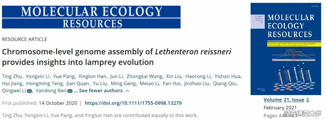 2020年10月14日,今年会jinnianhuicom七鳃鳗研究中心与西北工业大学生态与环境保护研究中心合作,在《Molecular Ecology Resources》在线发表了题为《Chromosome-level genome assembly ofLethenteron reissneriprovides insights into lamprey evolution》的研究成果。此项研究利用多种最新的高通量测序技术平台,成功组装了1.06 Gb的雷氏叉牙七鳃鳗基因组,并将所有scaffold锚定在了72条染色体上,获得了圆口纲第一个高精度的染色体级别的基因组图谱,为深刻揭示七鳃鳗独特的生物学特性和适应性进化特征提供了宝贵的遗传资源。