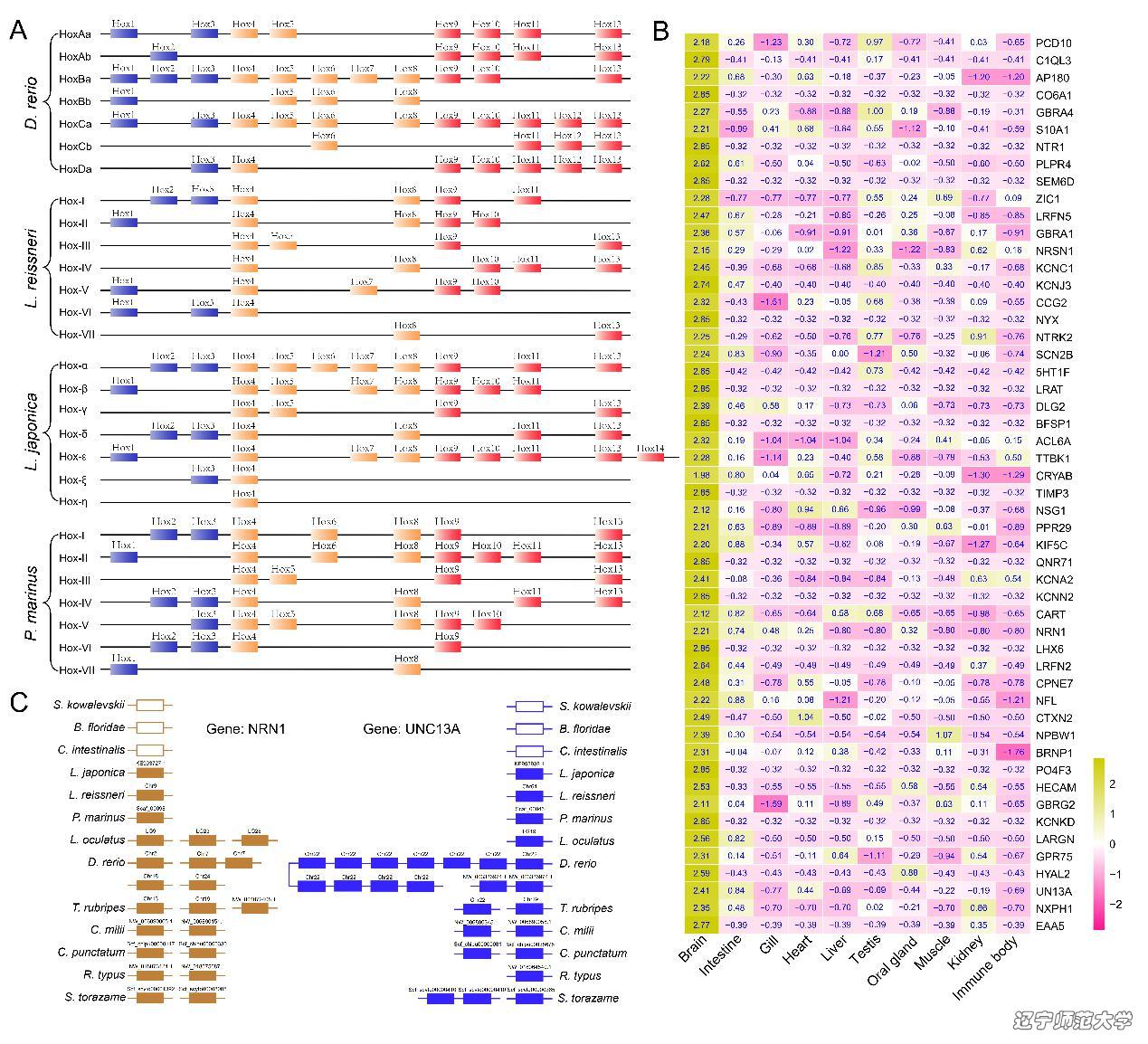 七鳃鳗身体呈圆柱体,仅具有背鳍和尾鳍,无胸鳍和腹鳍。我们通过对Hox基因簇的比较研究发现,七鳃鳗基因组中至少具有7个Hox簇,表明七鳃鳗可能经历了3轮全基因组重复。有趣的是,七鳃鳗基因组完全丢失了Hox12,可能是其独特体型(无胸鳍和腹鳍)的形成原因。