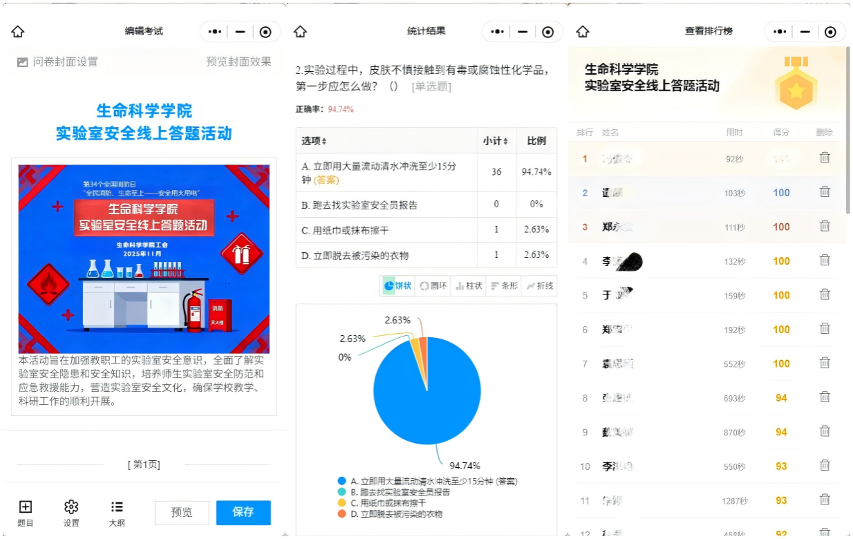 活动于2025年11月6日至9日通过线上方式进行,答题内容涵盖实验室安全管理规范、生物实验安全、危险化学品使用和保存、水电安全隐患处置、安全警示图标识别等。经系统评阅与综合统计,本次活动共产生一等奖1名、二等奖3名、三等奖5名及优秀奖若干。